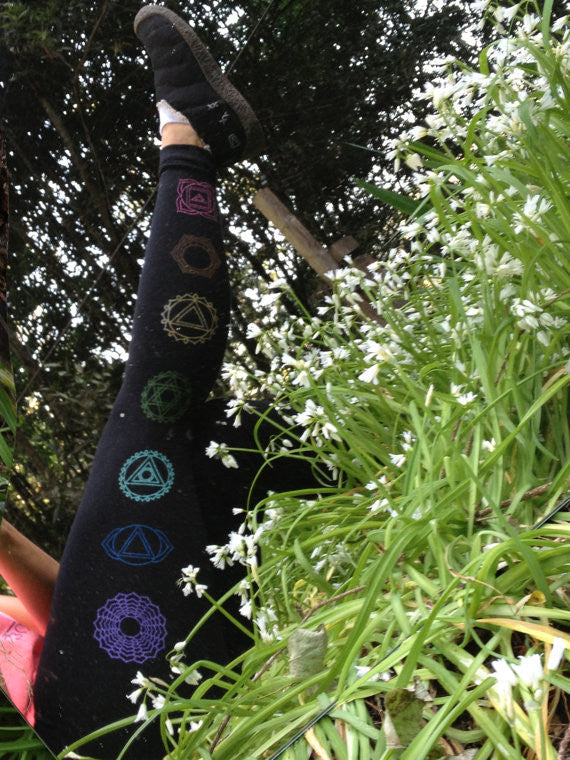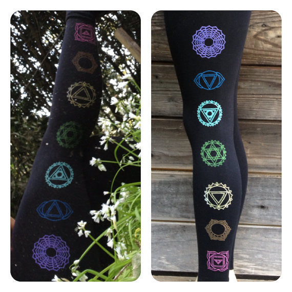 These leggings are designed and created by a spiritual artist in California, silk screened using eco-friendly, water based inks.